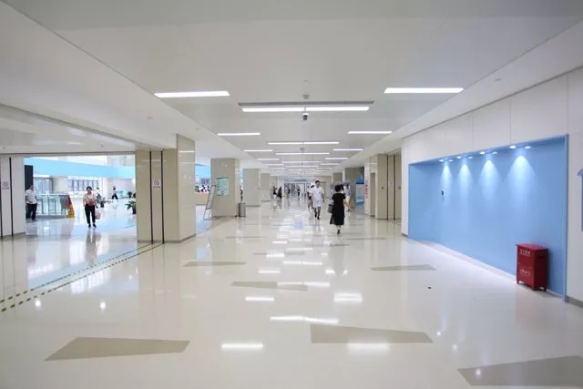 作為一種“高硬度,耐磨耐熱,持久光亮,無(wú)毒環(huán)?!钡氖覂?nèi)裝飾人造石材,榮冠崗石優(yōu)秀的性能受到了院方的高度認(rèn)可。青島大學(xué)醫(yī)學(xué)院附屬醫(yī)院嶗山院區(qū)采用了榮冠崗石雙色系列TR366/TR367型號(hào)的石材用于地面鋪貼,工程面積達(dá)到9000平方米。