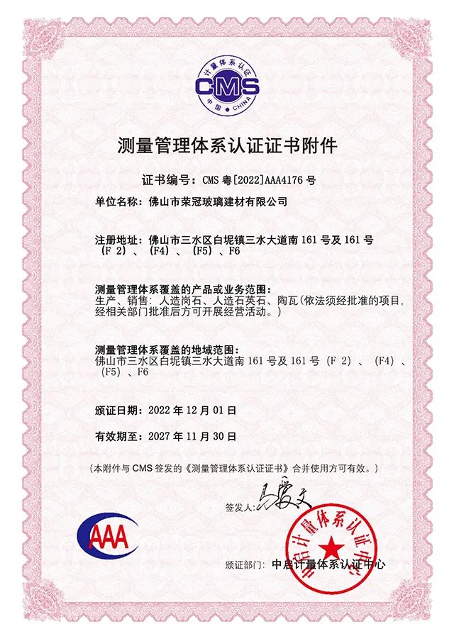 喜報!榮冠公司獲得AAA級“測量管理體系認證”證書!