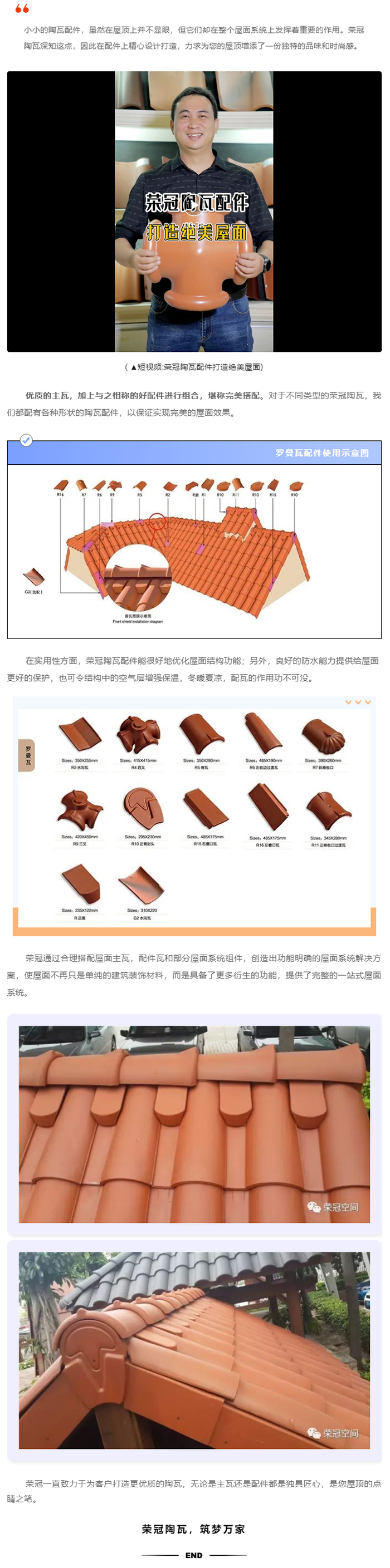 小小的陶瓦配件,雖然在屋頂上并不顯眼,但它們卻在整個屋面系統(tǒng)上發(fā)揮著重要的作用。榮冠陶瓦深知這點,因此在配件上精心設(shè)計打造,力求為您的屋頂增添了一份獨特的品味和時尚感.