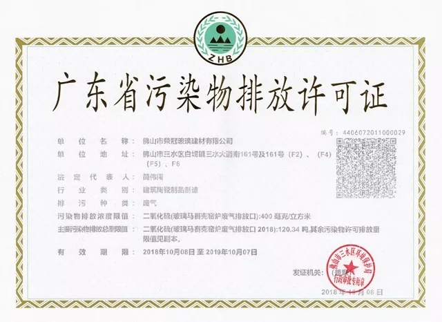 2018年10日,經(jīng)過政府部門的審查與勘察,榮冠公司的主要污染物排放濃度達(dá)到相關(guān)標(biāo)準(zhǔn),落實(shí)了環(huán)評(píng)的各項(xiàng)措施和要求,獲頒《廣東省污染物排放許可證》。而此前,榮冠也獲得了由廣東省科學(xué)技術(shù)廳授予的“廣東省節(jié)能與環(huán)保西瓦工程技術(shù)研究中心”稱號(hào)。