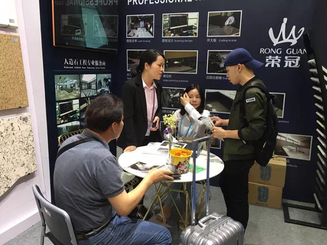 榮冠出口部工作人員向蒞臨展位的客戶講解了榮冠石英石臺(tái)面產(chǎn)品的品質(zhì)優(yōu)勢(shì),與來(lái)自全球各地的客商深入洽談合作。