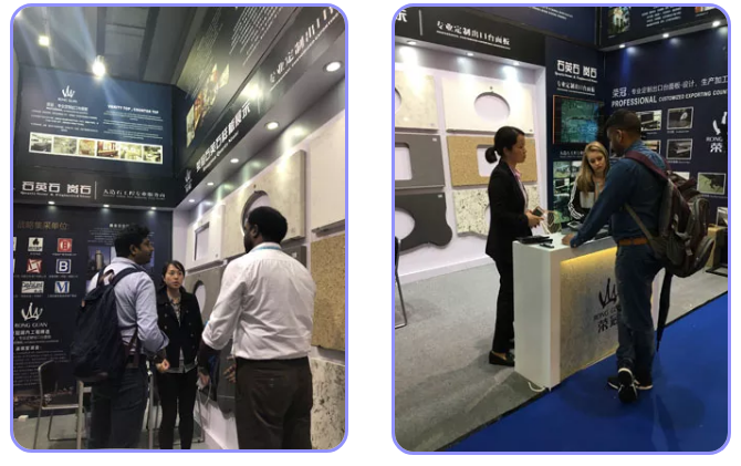 榮冠石材展位以深藍(lán)為底色,白色的門頭搭配高端黑色邊框,在整個(gè)展區(qū)尤為顯眼,吸引了眾多客戶前來(lái)參觀。榮冠石材專業(yè)定制出口臺(tái)面板,以匠心為客戶提供優(yōu)質(zhì)的產(chǎn)品和服務(wù)。