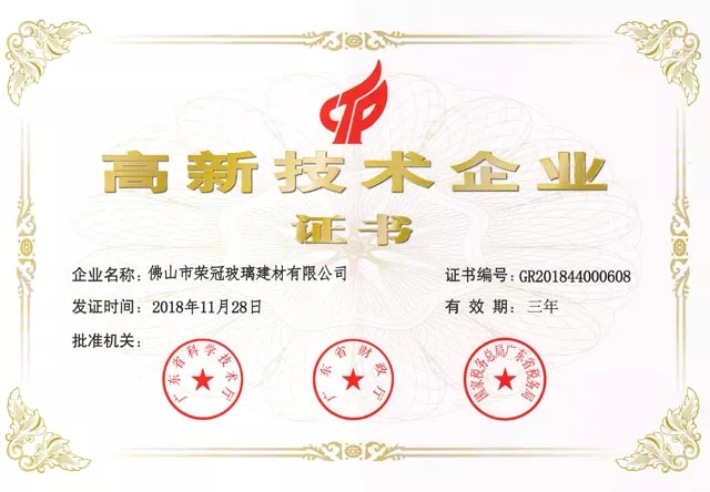 廣東省科學技術廳、廣東省財政廳、國家稅務總局廣東省稅務局,于4月26日發(fā)布了《廣東省2018年高新技術企業(yè)名單的通知》。佛山市榮冠玻璃建材有限公司(簡稱“榮冠公司”)憑借產品實力、自主研發(fā)水平、科技創(chuàng)新能力得到認可,被認定為“2018年廣東省高新技術企業(yè)”。