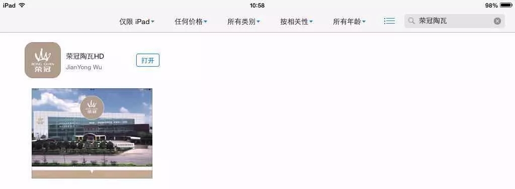 對于之前沒安裝過的客戶朋友,也可以通過打開 ipad自帶的AppStore(蘋果商店)搜索“榮冠陶瓦”進行下載安裝(如下圖所示)。安裝成功后即可直接使用。