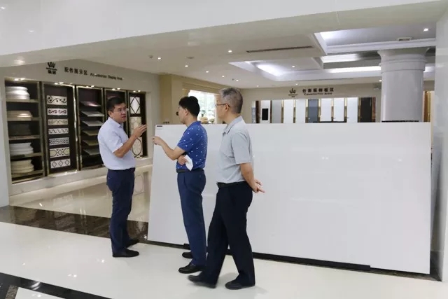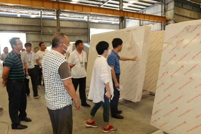 上午,考察團(tuán)一行對(duì)榮冠人造石展廳和人造石生產(chǎn)車(chē)間進(jìn)行了參觀考察。榮冠銷(xiāo)售負(fù)責(zé)人肖剛經(jīng)理逐一對(duì)我司人造石廠區(qū)的原料、生產(chǎn)設(shè)備、工藝流程等進(jìn)行了全面的講解展示。