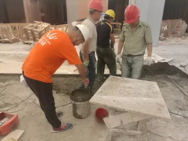 2.確認(rèn)基面無(wú)明水,在基面批刮專用人造石膠粘劑(條形狀/滿批刮)厚度3mm-5mm,石材背面同樣做法,厚度為23m,然后粘貼石材。
