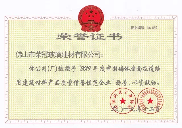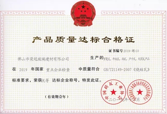 2019年12月13-15日,“2019年全國墻體屋面及道路用建筑材料產(chǎn)品質(zhì)量分析總結(jié)會暨綠色高質(zhì)量發(fā)展論壇”在安徽省淮北市隆重召開。榮冠建材在會上被授予“2019年度中國墻體屋面及道路用建筑材料產(chǎn)品質(zhì)量信譽(yù)模范企業(yè)”榮譽(yù)稱號,公司生產(chǎn)的羅曼瓦、平板瓦、西瓦、盧卡瓦、天筒瓦產(chǎn)品在國家重點(diǎn)企業(yè)檢查中榮獲“ 優(yōu)等達(dá)標(biāo)企業(yè) “ 稱號。