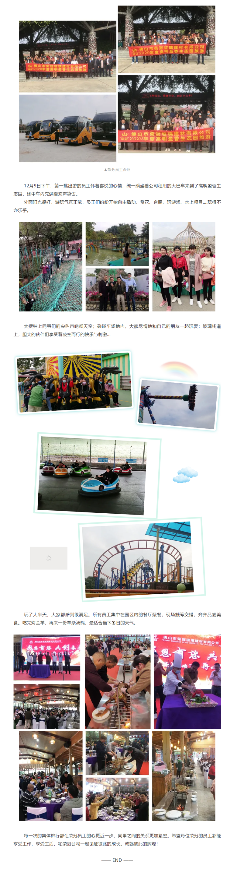 為感謝全體員工的辛苦付出和辛勤勞動,榮冠公司特意組織員工們進(jìn)行集體旅游和聚餐。讓大家在舒緩工作壓力的同時(shí),放松自己的身心,增強(qiáng)同事之間的感情與凝聚力,加強(qiáng)對公司文化的認(rèn)同感和歸屬感,以更加飽滿的熱情投入到以后的工作和生活中去。