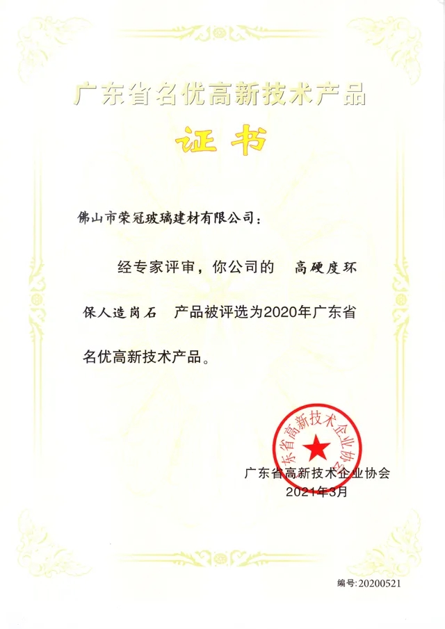 榮冠公司憑借的“高硬度環(huán)保人造崗石”產(chǎn)品成功入選,斬獲廣東省高新技術(shù)產(chǎn)品稱號,標(biāo)志著榮冠公司在人造石領(lǐng)域的綜合優(yōu)勢和核心競爭力。