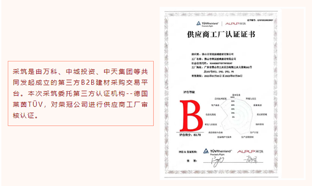 近日,榮冠公司成功通過采筑平臺供應(yīng)商工廠認(rèn)證,獲得其平臺頒發(fā)的供應(yīng)商工廠認(rèn)證證書。