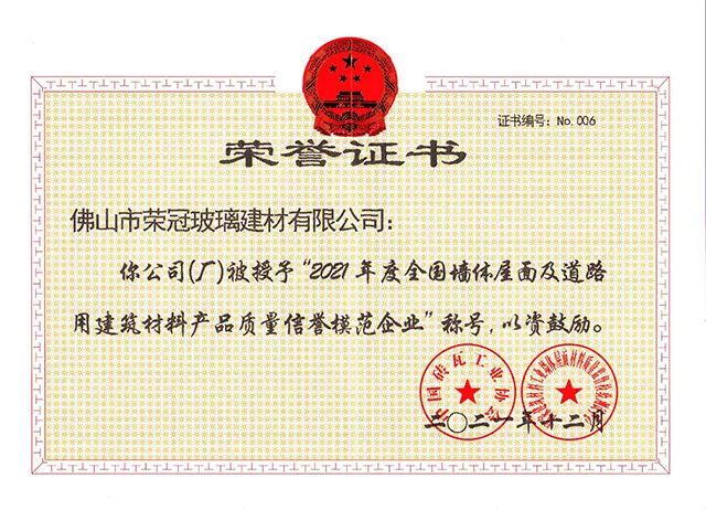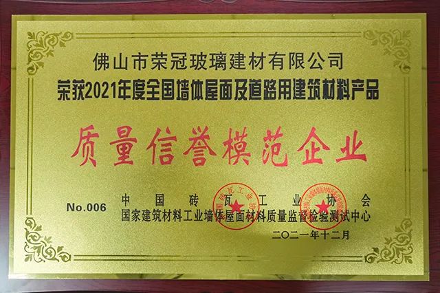 為促進(jìn)行業(yè)技術(shù)創(chuàng)新、節(jié)能減排、減污降碳及質(zhì)量提升,樹立標(biāo)桿效應(yīng)和品牌效應(yīng)。會上,對佛山市榮冠玻璃建材有限公司等82家企業(yè)授予了“2021年度全國墻體屋面及道路用建筑材料產(chǎn)品質(zhì)量信譽(yù)模范企業(yè)”稱號。這是榮冠公司連續(xù)4年獲得該項(xiàng)榮譽(yù)。