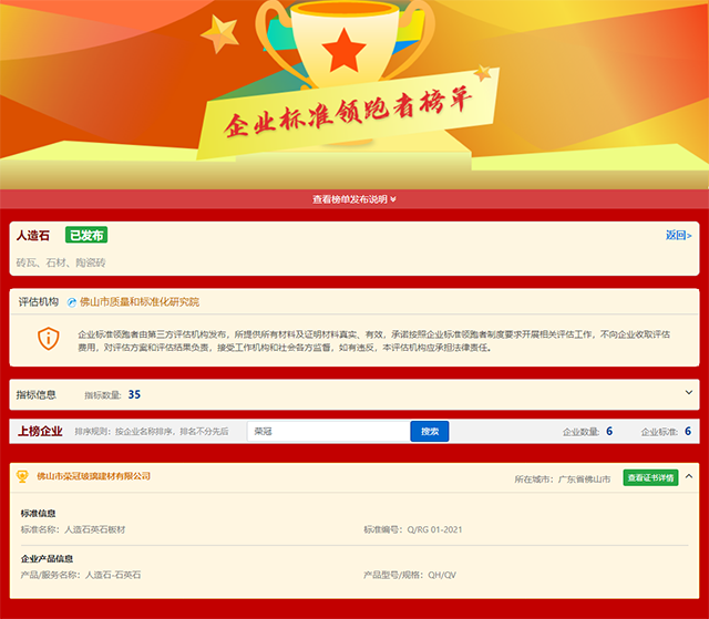 多年來(lái),榮冠公司在人造石行業(yè)領(lǐng)域持續(xù)研發(fā)創(chuàng)新,建立了完善的企業(yè)技術(shù)標(biāo)準(zhǔn)體系,并參與多項(xiàng)國(guó)家標(biāo)準(zhǔn)的起草和制定,以達(dá)到先進(jìn)標(biāo)準(zhǔn)為目標(biāo),不斷提升產(chǎn)品質(zhì)量和服務(wù)水平。本次榮譽(yù)的獲得,不僅僅代表著行業(yè)和市場(chǎng)對(duì)榮冠品牌和產(chǎn)品的認(rèn)可,也體現(xiàn)了榮冠企業(yè)自身的雄厚實(shí)力。