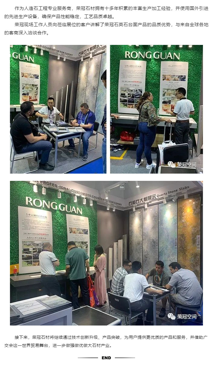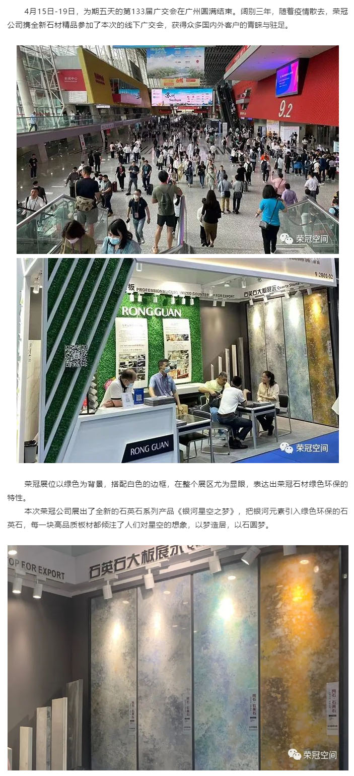 4月15日-19日,為期五天的第133屆廣交會在廣州圓滿結(jié)束。闊別三年,隨著疫情散去,榮冠公司攜全新石材精品參加了本次的線下廣交會,獲得眾多國內(nèi)外客戶的青睞與駐足。