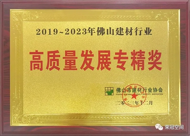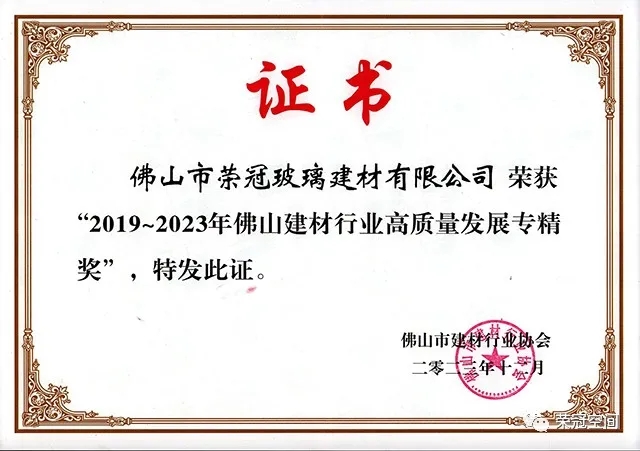 在會(huì)議中,佛山市建材行業(yè)協(xié)會(huì)表彰了一批在高質(zhì)量發(fā)展方面做出優(yōu)異成績(jī)的先進(jìn)集體和在協(xié)會(huì)第三屆工作中做出突出貢獻(xiàn)的優(yōu)秀個(gè)人。佛山市榮冠玻璃建材有限公司等24家企業(yè)獲得了“2019~2023年佛山建材行業(yè)高質(zhì)量專(zhuān)精獎(jiǎng)”。